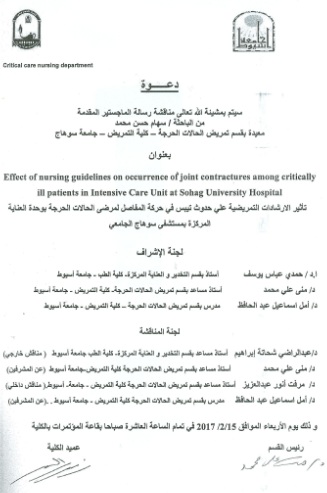 By God willing, master thesis submitted by researcher/ Seham Hassan Mohamed, demonstrator, Critical Care Nursing department, Faculty of Nursing, Sohag University- will be discussed on Wednesday, 15/2/2017, at 10:00 a.m., at the conference hall of the college.