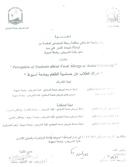 By God willing, master thesis submitted by researcher/ Shaimaa Gandour Ali - demonstrator, Public Health Nursing, Faculty of Nursing, Assiut University - will be discussed on Wednesday, 6/9/2017, at 11:00 a.m., at the conference hall of the college.