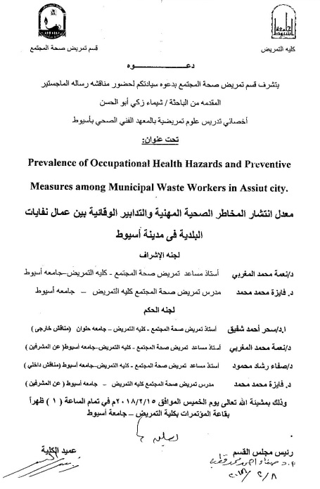 By God willing, master thesis submitted by researcher/ Shaimaa Zaki Abou El Hassan, nursing specialist, will be discussed on Thursday, 15/2/2018, at 1:00 p.m., at the conference hall of the college.