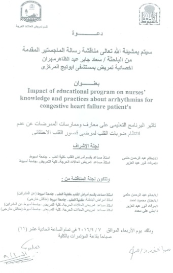 By God willing, master thesis submitted by researcher/ Souad Gaber Abd El-Zaher Mahran – Nursing specialist - will be discussed on Wednesday, 7/9/2016, at 11:00 a.m., at the conference hall of the college.