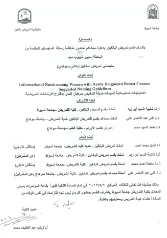 By God willing, master thesis submitted by researcher/ Souhier Shaibob Sayed, Nursing Specialist, will be discussed on Tuesday, 9/5/2017, at 2:00 p.m., at the conference hall of the college.