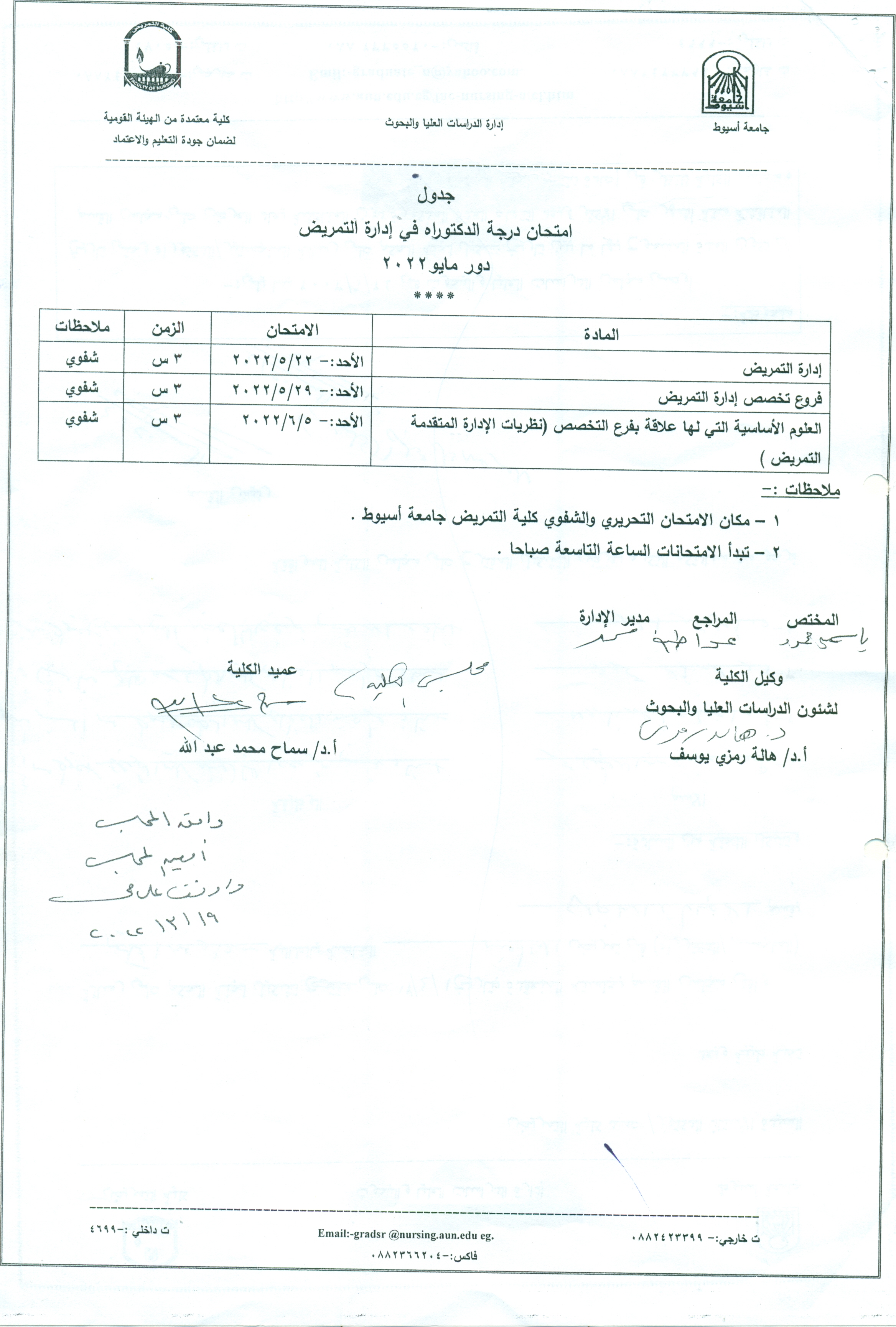Doctoral degree exam schedule in Nursing administration, May 2022