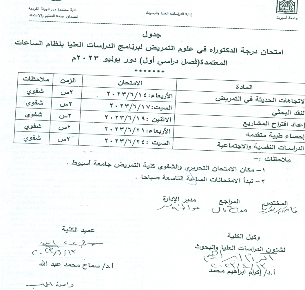 Doctoral degree exam schedule in nursing sciences for the postgraduate program with the credit hour system (first semester) June 2023 session 31 May 2023