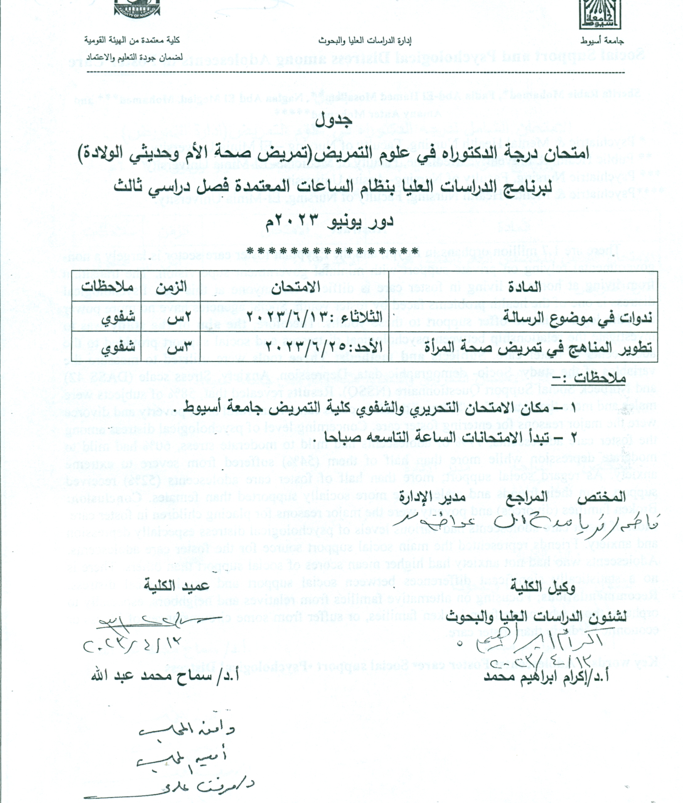 Doctoral Degree Examination Schedule in Nursing Sciences (Maternal and Newborn Health Nursing) for the Postgraduate Program with the Credit Hour System, Third Semester, June 2023