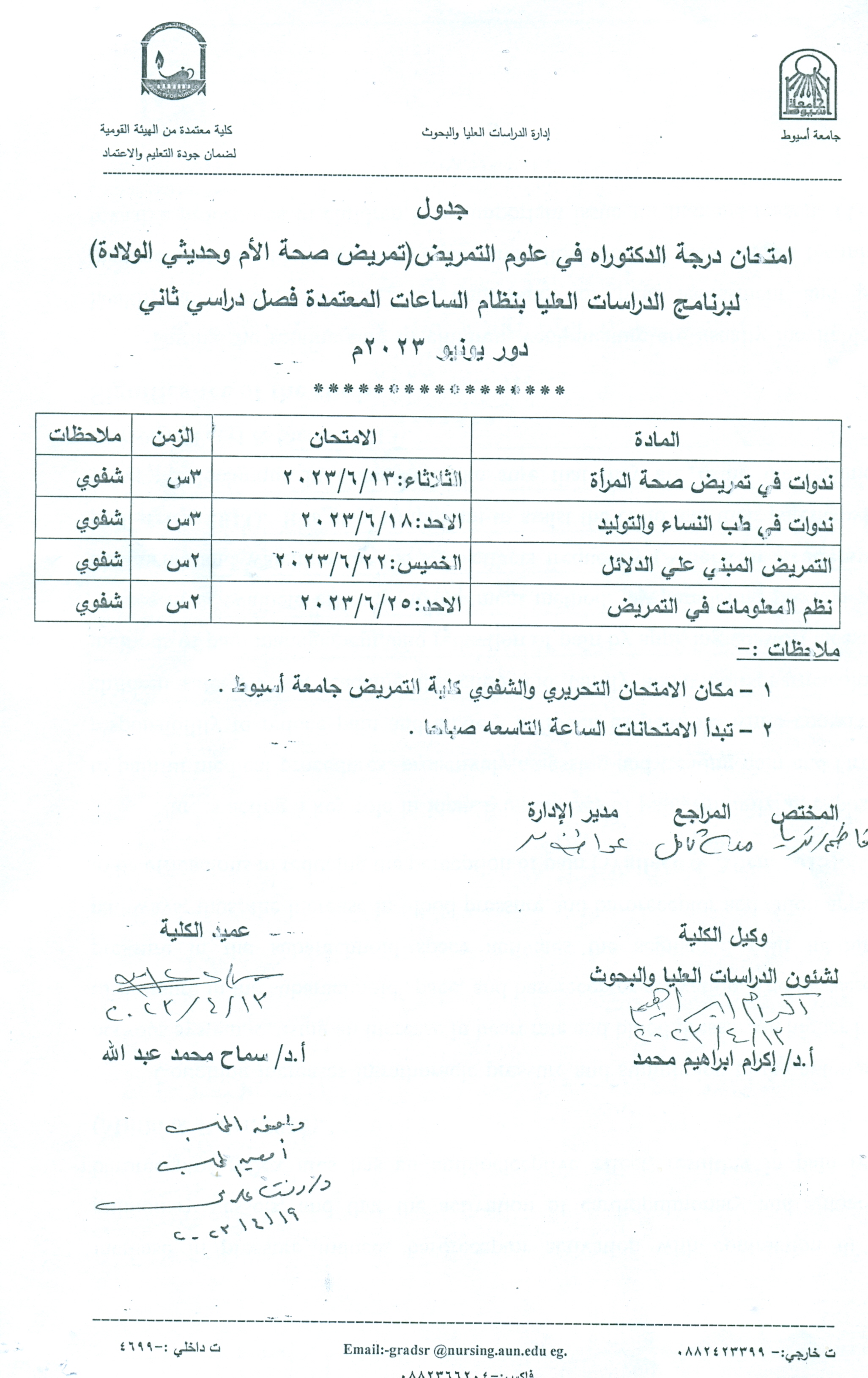 Doctoral Degree Examination Schedule in Nursing Sciences (Maternal and Newborn Health Nursing) for the Postgraduate Program with the credit hour system, second semester, June 2023