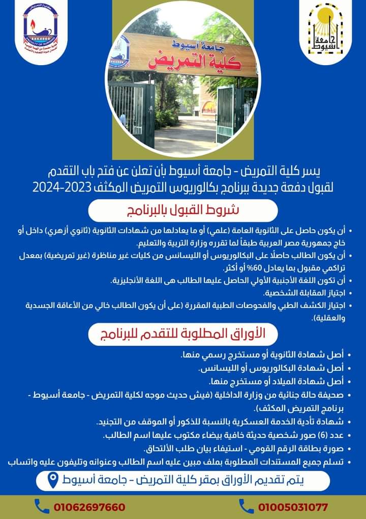 The Faculty of Nursing, Assiut University is pleased to announce the opening of admission for a new batch in the accelerated bachelor's program - the sixth batch. The last date for submitting and receiving papers is 1/9/2023