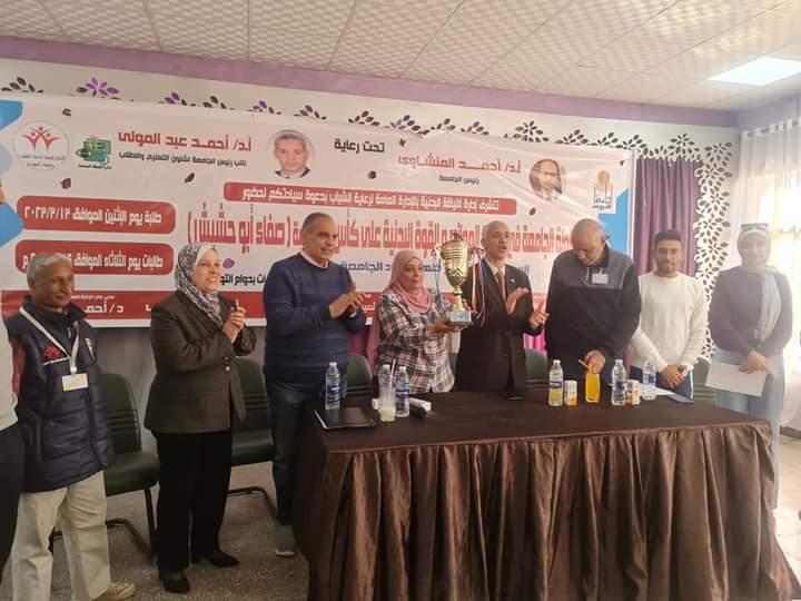 كلية التمريض تحصد المركز الأول على مستوى الجامعة فى بطوله الجامعه في اجتياز الموانع والقوه البدنية تحصل علي كأس المرحومه صفاء أبو حشيش.تحت رعاية السيد الاستاذ الدكتور أحمد المنشاوي رئيس الجامعة والسيد الاستاذ الدكتور أحمد عبد المولى نائب رئيس الجامعة لشئون التعليم والطلاب وبحضور السيد الاستاذ الدكتور سماح محمد عبدالله عميد الكلية والسيد الاستاذ الدكتور فاطمة رشدى محمد وكيل الكلية لشئون التعليم والطلاب تم تكريم الطلاب والطالبات الحاصلين على المراكز الأول فى مسابقة اجتياز الموانع وكان عددهم ٦ طلاب من العشر وعدد ٤ طالبات من العشر على مستوى الجامعة كما حصلت الكلية على الكأس العام للبطولة .الف مبروك لابناءنا الطلاب ومزيد من النجاحات لكليتنا الحبيبه