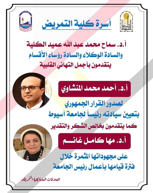 The family of the Faculty of Nursing extend their warmest heartfelt congratulations to Prof. Dr. Ahmed Mohamed Kamal El-Minshawy 7 February 2023 لصدور القرار الجمهورى بتعيين سيادته رئيساً لجامعة أسيوط كما يتقدمون بخالص الشكر والتقدير السيد الأستاذ الدكتور/ مها كامل غانم على مجهودتها المثمرة خلال فترة قيامها بأعمال رئيس جامعة