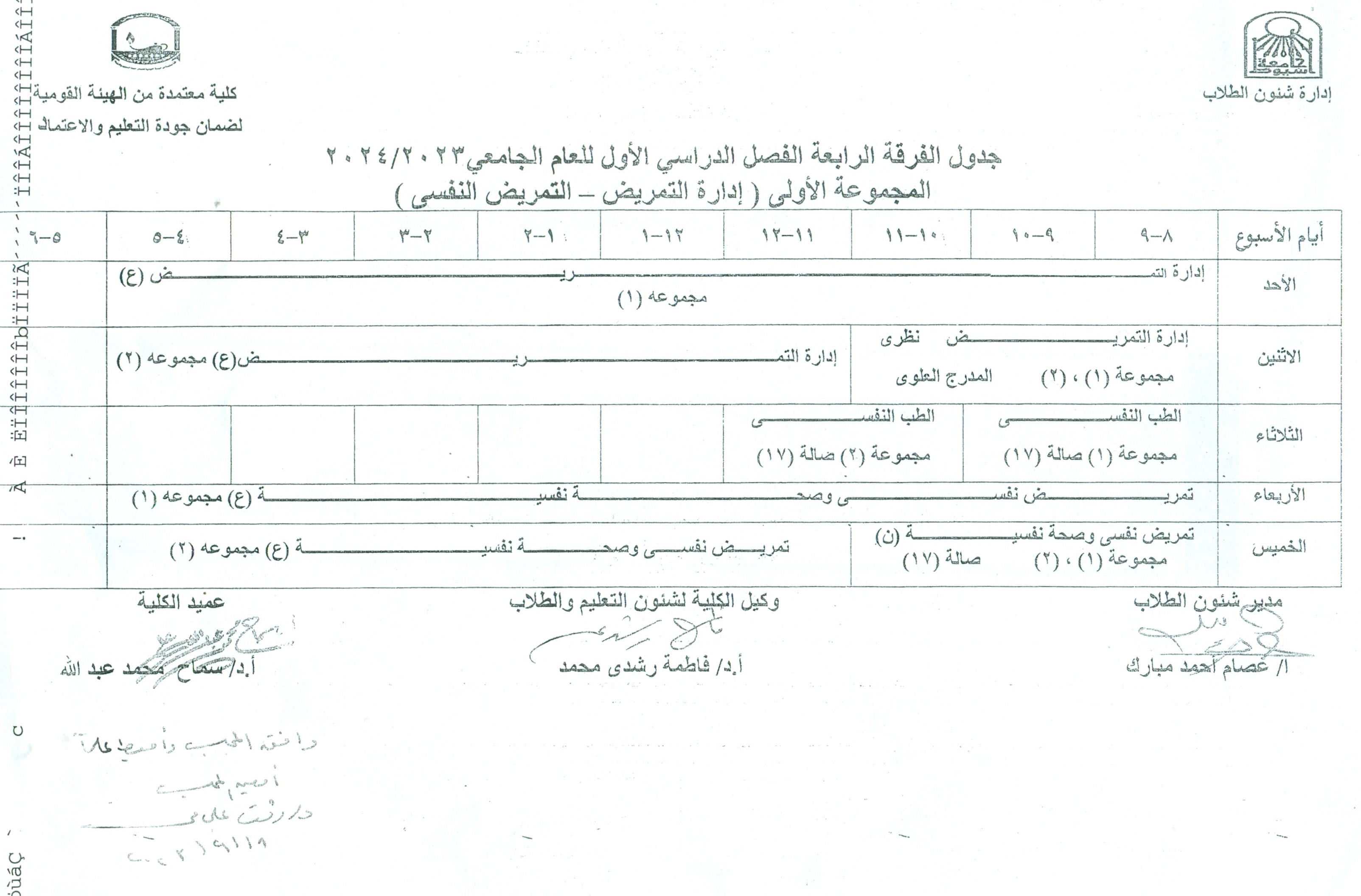 Fourth year schedule for the first semester of the academic year 2023/2024 AD, second group (Nursing Administration - Psychiatric Nursing) 2 October 2023