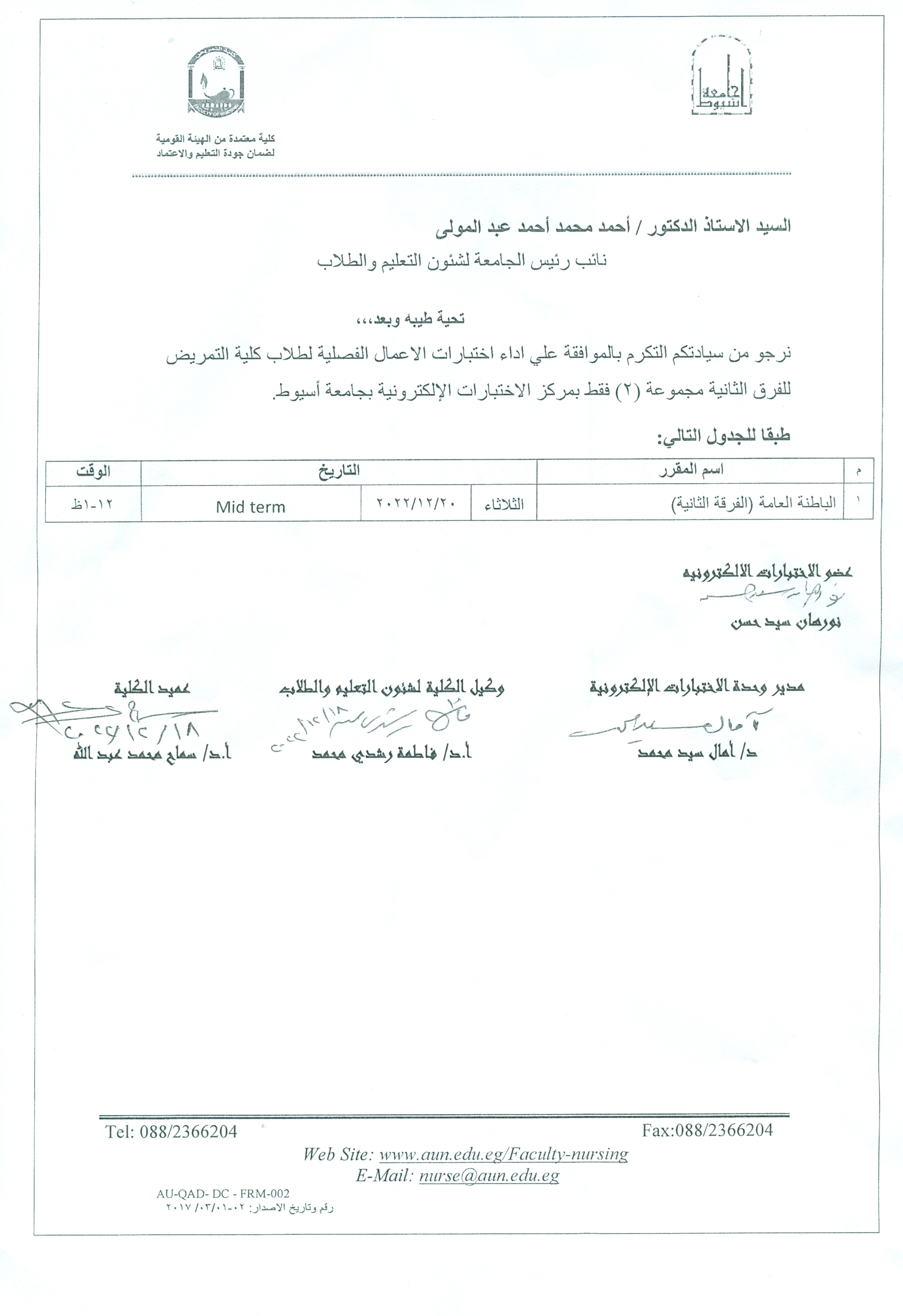 Prof. Dr. Fatima Rushdi Mohammed, Dean of the Faculty of Nursing at Assiut University, along with the Vice Deans, Heads of Academic Departments, and all administrative staff, extend their warmest heartful congratulations