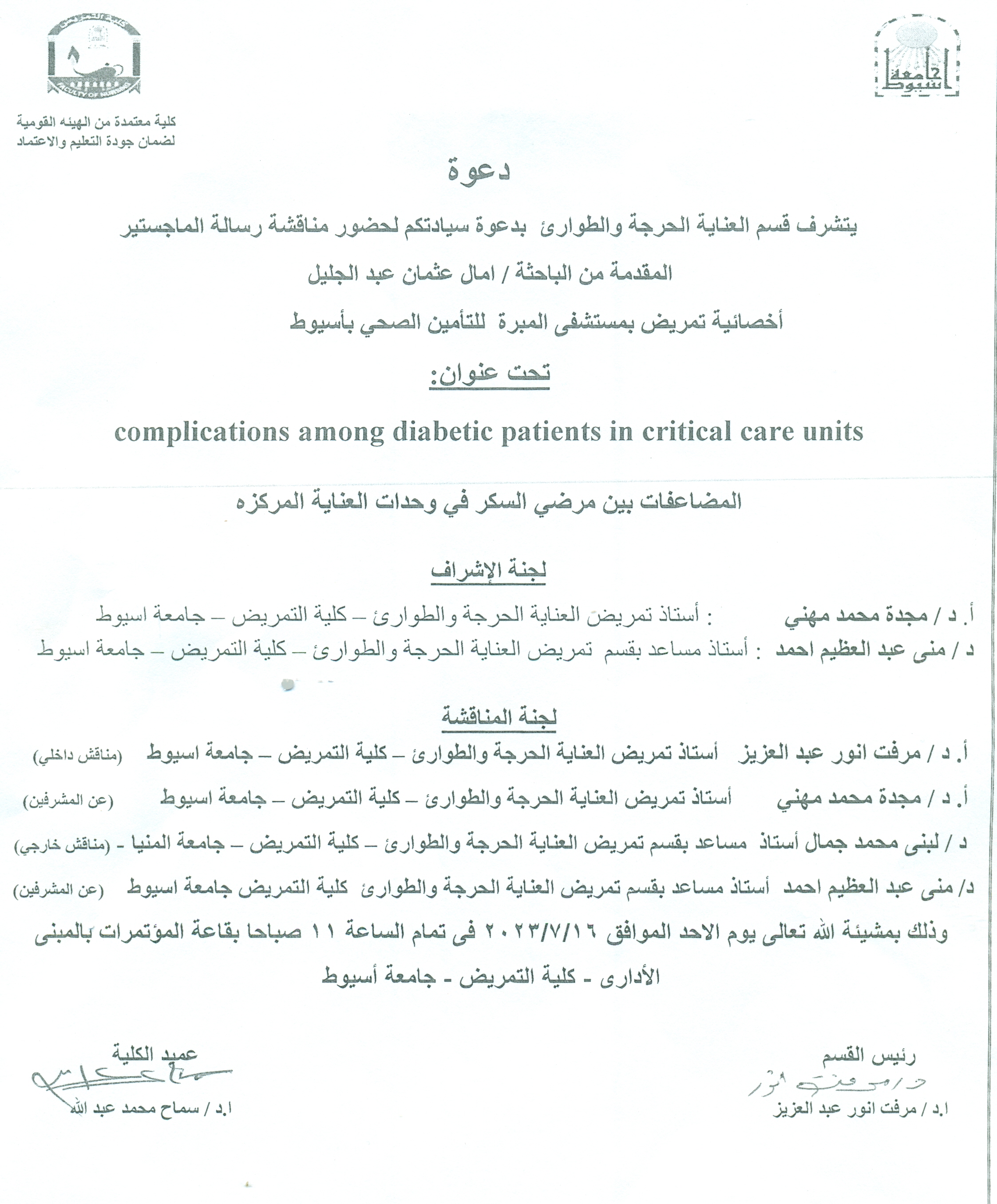 On Sunday, corresponding to 7-16-2023 AD, at exactly 11 am, in the conference hall in the administrative building - Faculty of Nursing - Assiut University