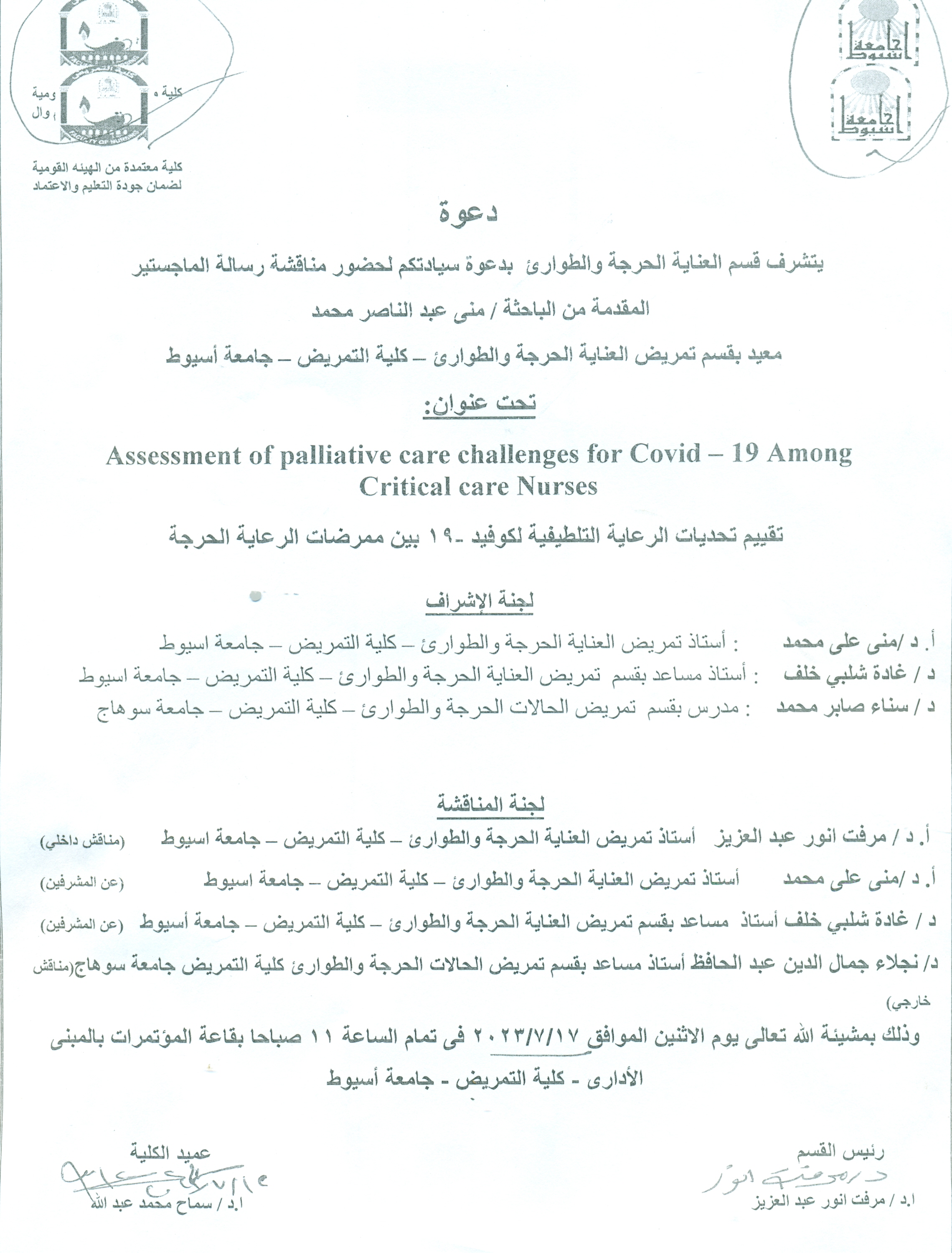 On Monday, corresponding to 7-17-2023 AD, at 11:00 am, in the conference hall in the administrative building - Faculty of Nursing - Assiut University