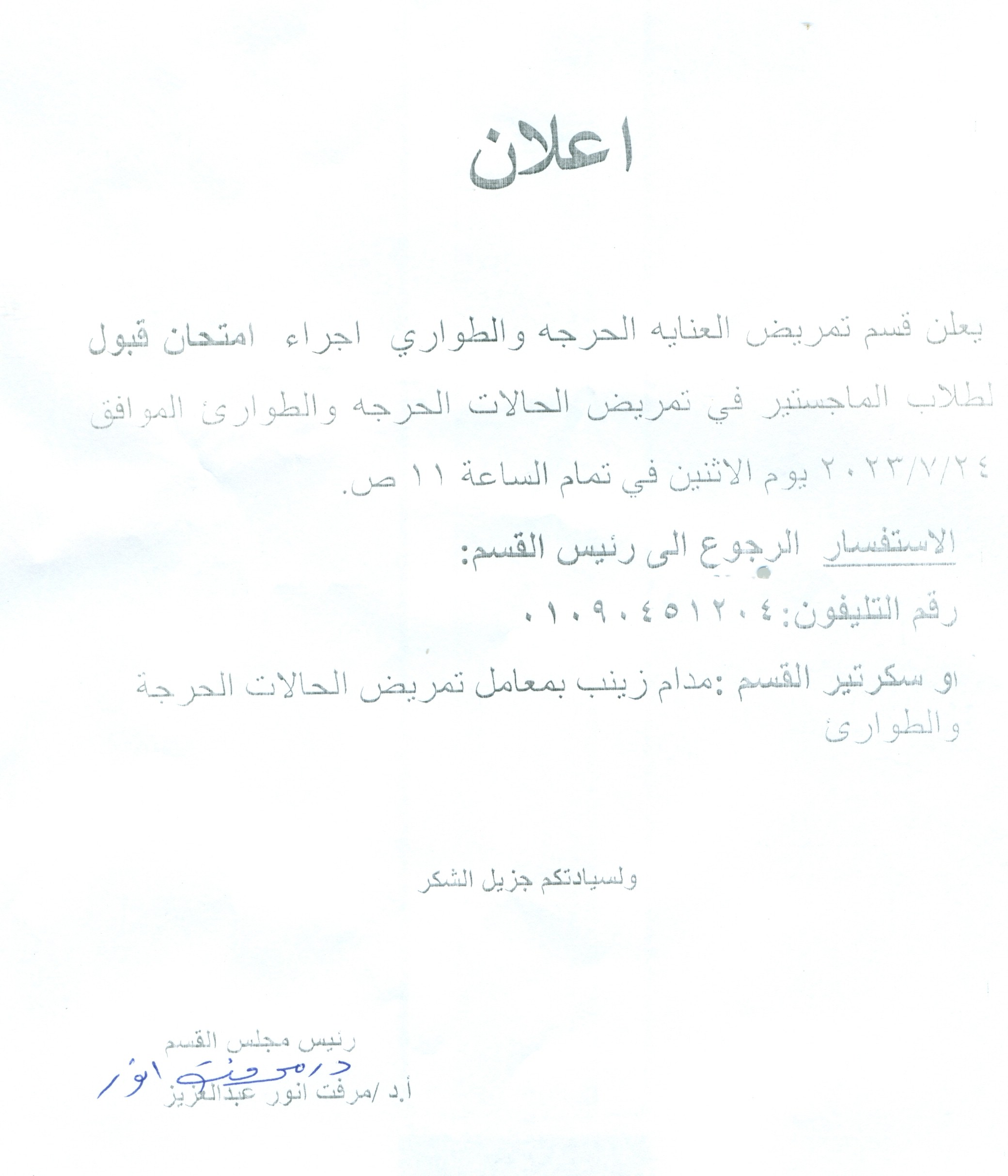 Important Announcement: The Critical Care and Emergency Nursing Department announces that an admission exam will be held for Masters students in Critical and Emergency Nursing on Monday, 7/24/2023 AD at 11 am