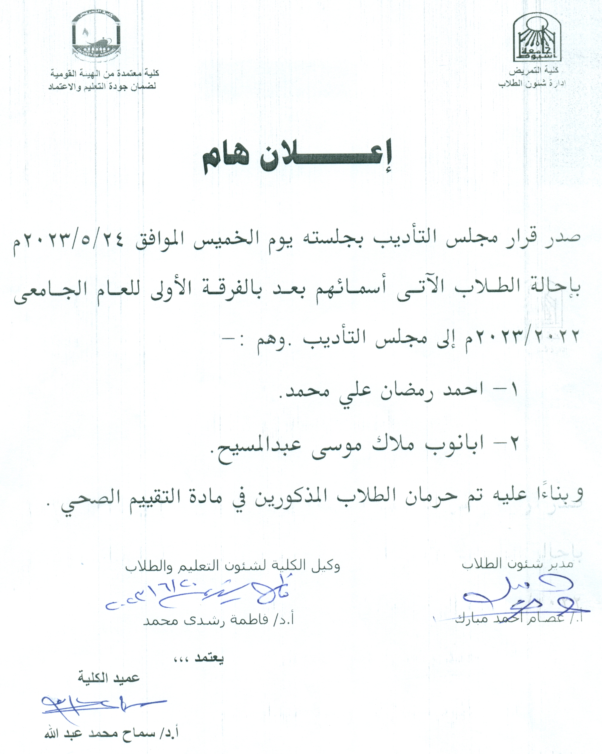 Important Announcement: The following students were deprived and referred to the Disciplinary Council. 1-Ahmed Ramadan Ali Muhammad 2- Abanoub Malak Musa Abdel-Masih in the subject of health assessment