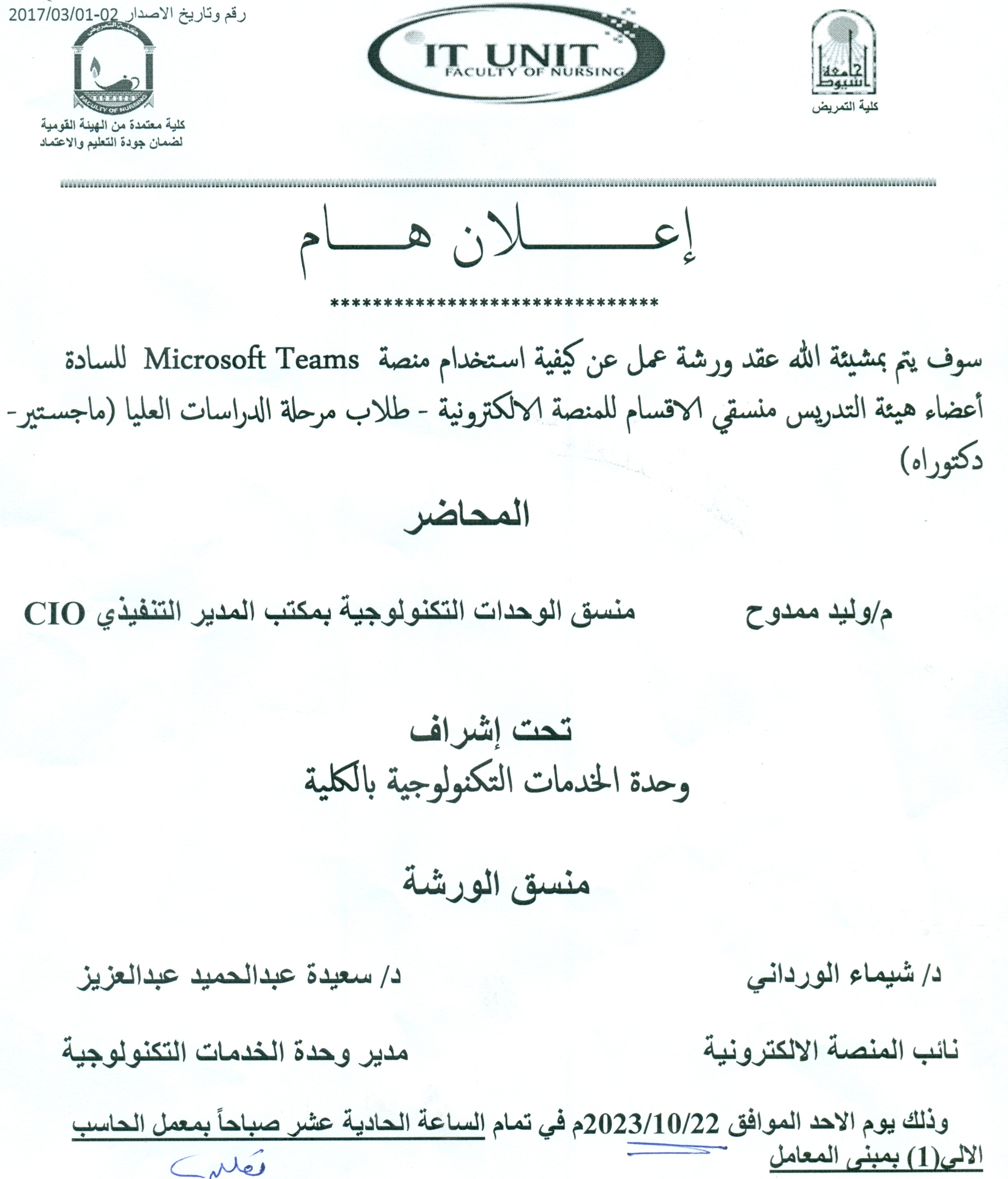 An important announcement: God willing, a workshop will be held on how to use the Microsoft Teams platform for faculty members, department coordinators for the electronic platform - postgraduate students.