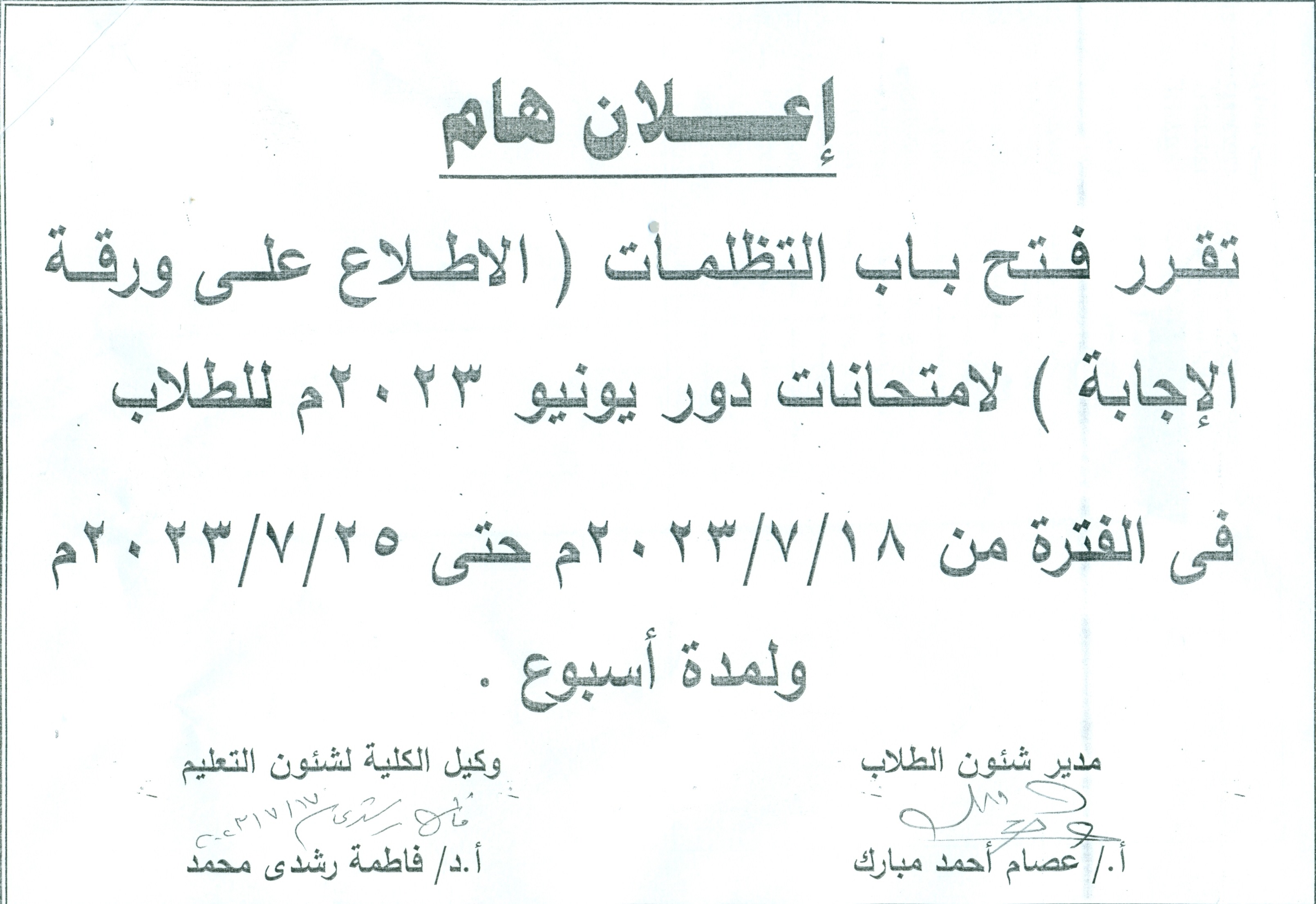 Important Announcement: It has been decided to open the door for grievances for June 2023 exams for students 18 July 2023