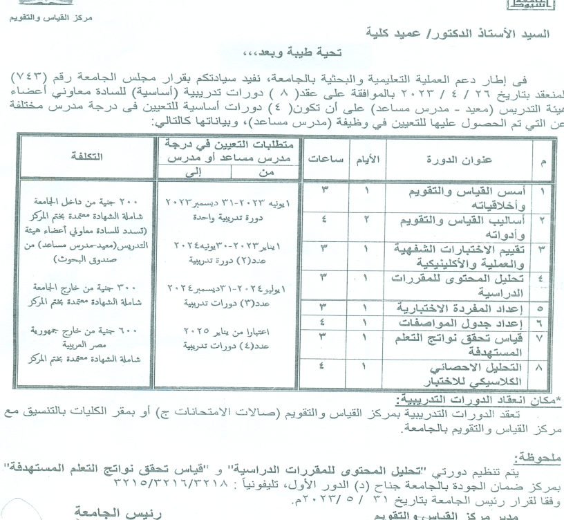 Important *** The decision of the University Council held on 4-26- 2023 to approve the holding of training courses for assistant faculty members, provided that they are essential for appointment to a teacher’s rank different
