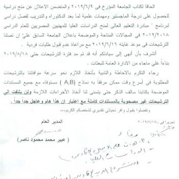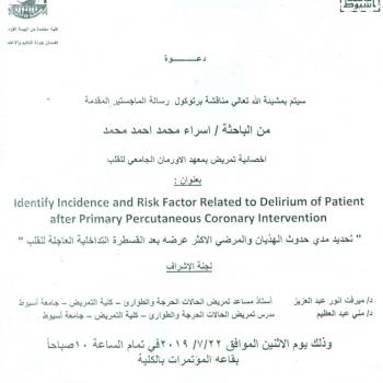 By God willing, protocol of master thesis submitted by researcher/ Essraa Mohamed Ahmed, nursing specialist, will be discussed on Monday, 22/7/2019, at 10:00 a.m., at the conference hall of the…