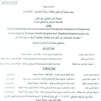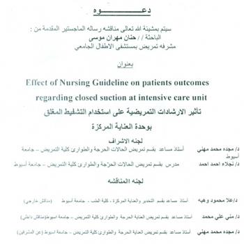 By God willing, master thesis submitted by researcher/ Hanan Mehran Mousa, nursing specialist, will be discussed on Wednesday, 31/7/2019, at 10:00 a.m., at the conference hall of the college.