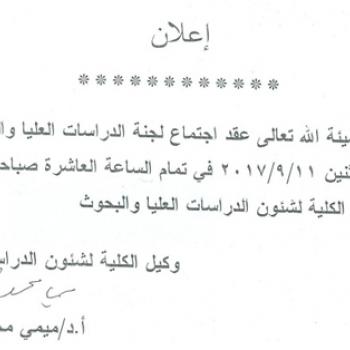By God willing, meeting of the graduate studies committee chaired by Prof. Dr./ Mimi Mohamed Mekawy, Vice Dean for Graduate Studies and Research, will be held on Monday, 11/9/2017, at 10:00 a.m., at…