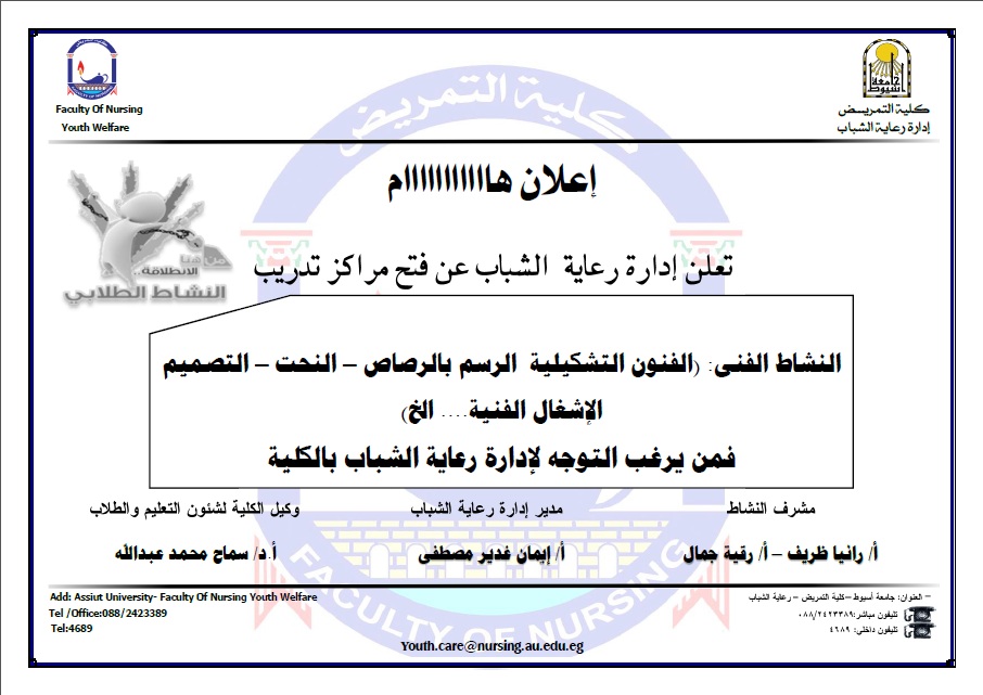 إعلان إدارة رعاية الشباب عن فتح مراكز تدريب النشاط الفني (الفنون التشكيلية الرسم بالرصاص-النحت-التصميم-الإشغال الفنية....الخ) 1 أكتوبر 2017 إعلان إدارة رعاية الشباب عن فتح مراكز تدريب النشاط الفني (الفنون التشكيلية الرسم بالرصاص-النحت-التصميم-الإشغال الفنية....الخ)