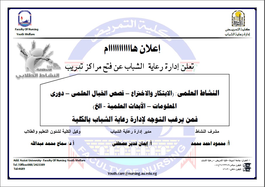 إعلان إدارة رعاية الشباب عن فتح مراكز تدريب النشاط العلمي 1 أكتوبر 2017 إعلان إدارة رعاية الشباب عن فتح مراكز تدريب النشاط العلمي