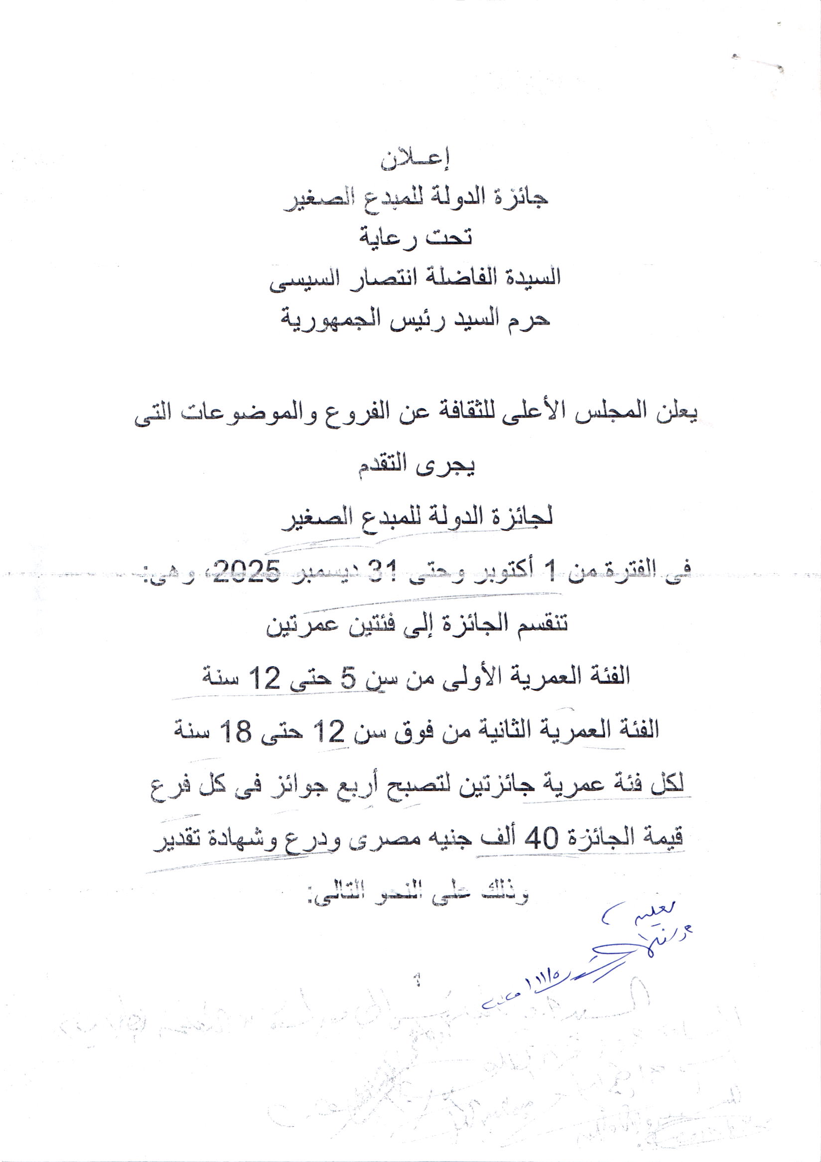 إعلان جائزة الدولة للمبدع الصغير في الفترة من 1 أكتوبر وحتي 31 ديسمبر 2025م