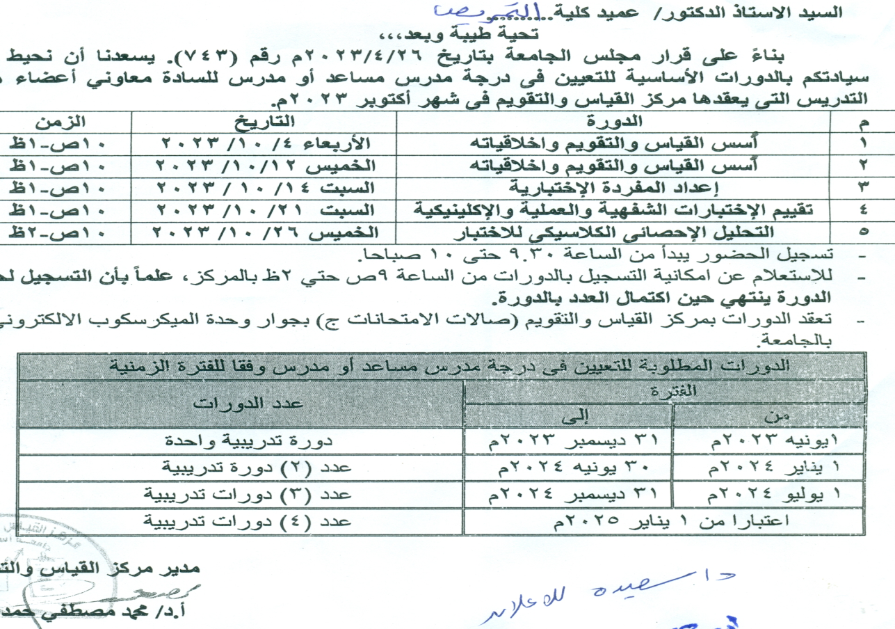 الدورات الاساسية للتعيين في درجة مدرس مساعد أو مدرس للسادة معاوني أعضاء هيئة التدريس التي يعقدها مركز القياس والتقويم في شهر أكتوبر 2023م 21 سبتمبر 2023