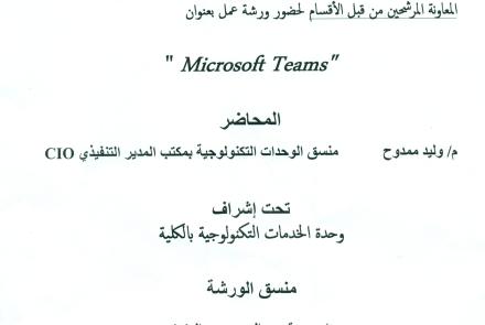 تتشرف وحدة الخدمات التكنولوجية بالكلية بدعوة السادة أعضاء هيئة التدريس والهيئة المعاونة المرشحين من قبل الاقسام لحضور ورشة عمل بعنوان "Microsoft Teams"