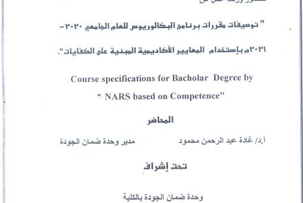 ورشة عمل عن توصيفات مقررات برنامج البكالوريوس للعام الجامعي 2020-2021 باستخدام المعايير الاكاديمية المبنية علي الكفايات