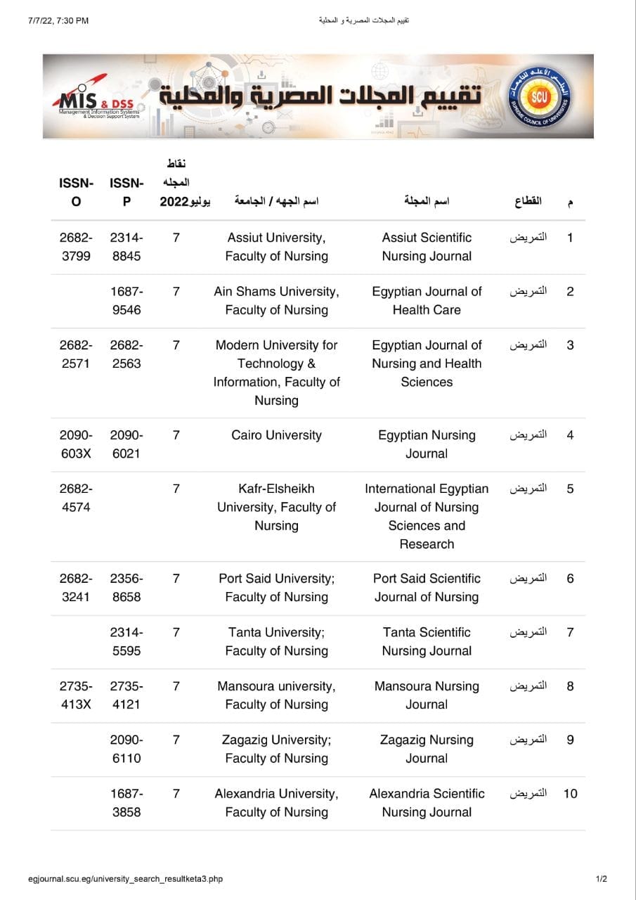 المجلة العلمية لكلية التمريض تحصل على المركز الأول فى تقييم المجلات المصرية والمحلية على مستوى قطاع التمريض بجمهورية مصر العربية 7 يوليو 2022 تتقدم السيد الاستاذ الدكتور/ سماح محمد عبدالله عميد الكلية بأجمل التهانى القلبية لأسرة الكلية عامة وقطاع الدراسات العليا والبحوث خاصة وأسرة المجلة العلمية بالكلية بأجمل التهانى القلبية لحصول المجلة العلمية بالكلية على المستوى الأول وفقا لما أعلنة المجلس الأعلى للجامعات بشأن تقييم المجلات المصرية والمحلية وتخص بالشكر السيد الاستاذ الدكتور/ هالة رمزي وكيل الكلية للدراسات العليا والبحوث والسيد الاستاذ/ احمد فتحى فراج سكرتير ادارى المجلة على العمل الدؤب والمتميز وكافة القائمين على العمل بالمجلة العلمية