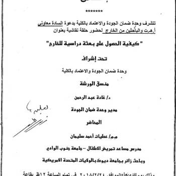 سوف يتم بمشيئة الله تعالى اجتماع لجنة شئون التعليم والطلاب برئاسة السيدة الأستاذ الدكتور / سماح محمد عبدالله- وكيل الكلية لشئون التعليم والطلاب.وذلك يوم الثلاثاء الموافق 13/2/2018م …
