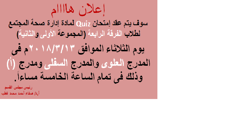 إمتحان Quiz لمادة إدارة صحة المجتمع لطلاب الفرقة الرابعة 12 مارس 2018 إمتحان Quiz لمادة إدارة صحة المجتمع لطلاب الفرقة الرابعة