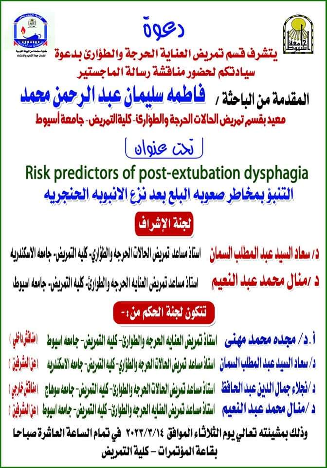 2023-03-14 ثلاثاء, 14 مارس 2023 - 12:00 بالصورحصول رسالة الماجستير الخاصة بالباحثة/فاطمة سليمان عبد الرحمن محمود معيد بقسم تمريض العناية الحرجة والطؤارى على تقدير امتياز
