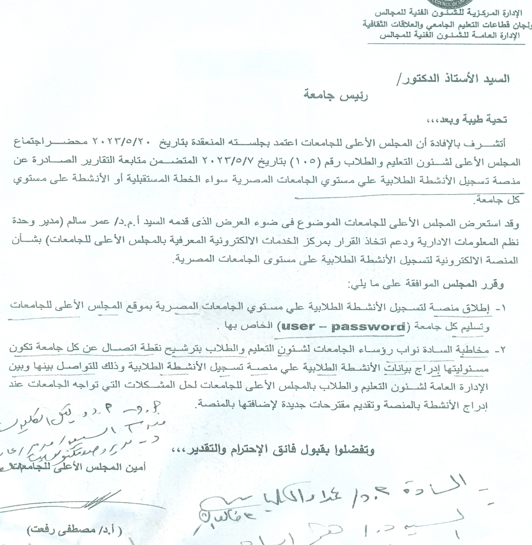 هـــــــام*** المجلس الأعلى للجامعات اعتمد بجلسته 20/5/2023 محضر اجتماع المجلس الأعلى لشئون التعليم والطلاب المتضمن متابعة التقارير الصادرة عن منصة تسجيل الانشطة الطلابية علي مستوي الجامعات المصرية