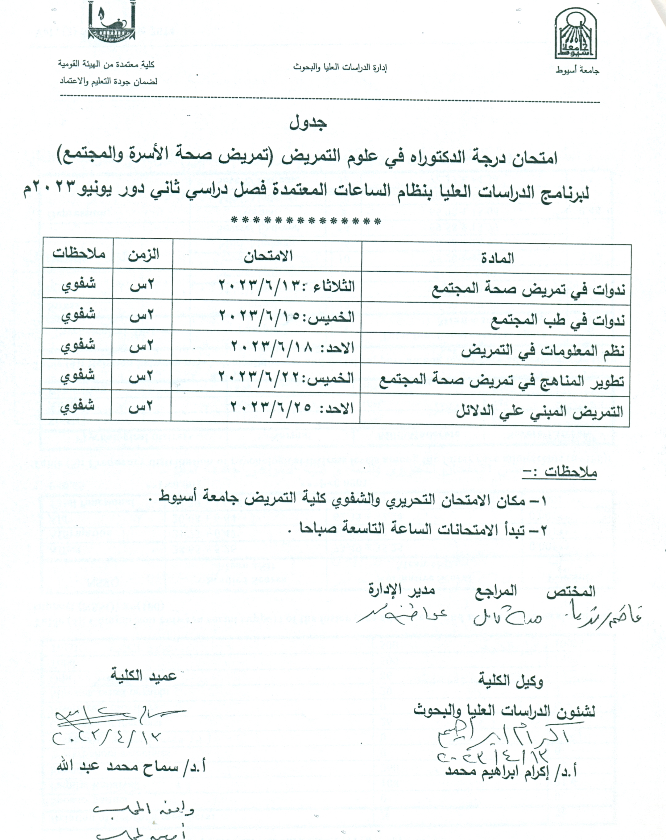 جدول امتحان درجة الدكتوراه في علوم التمريض (تمريض صحة الاسرة والمجتمع ) لبرنامج الدراسات العليا بنظام الساعات المعتمدة فصل دراسي ثاني دور يونيو 2023م 31 مايو 2023