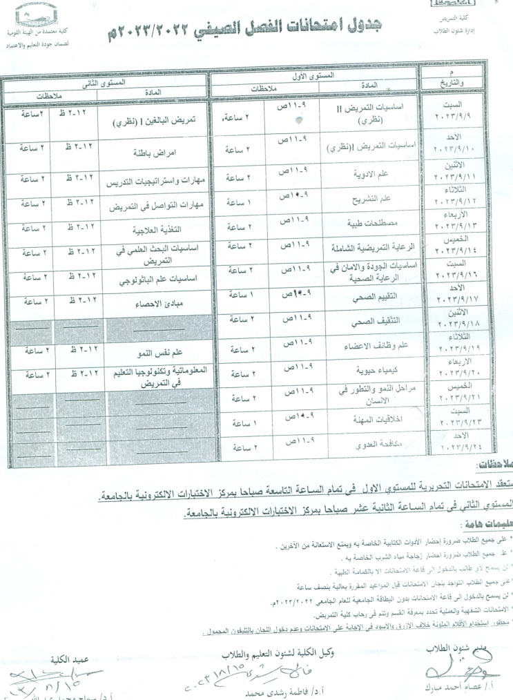 جدول امتحانات الفصل الصيفي 2022/2023م