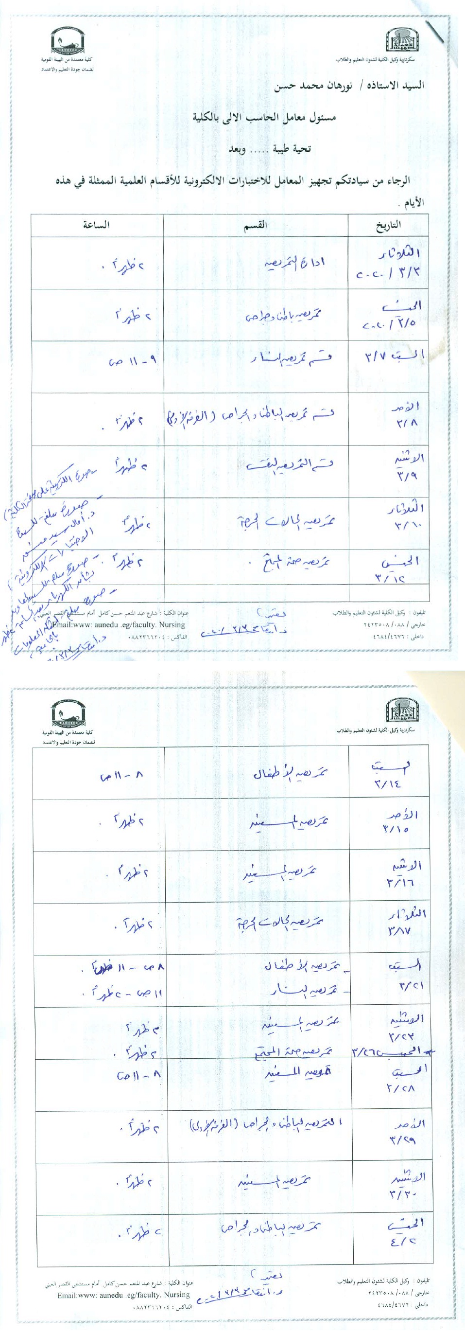 مواعيد الإختبارات الإلكترونية للأقسام العلمية بالكلية