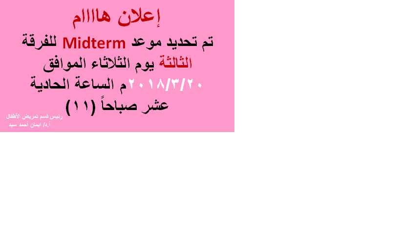 موعد Midterm للفرقة الثالثة يوم الثلاثاء الموافق 2018/3/20م 12 مارس 2018 موعد Midterm للفرقة الثالثة يوم الثلاثاء الموافق 2018/3/20م