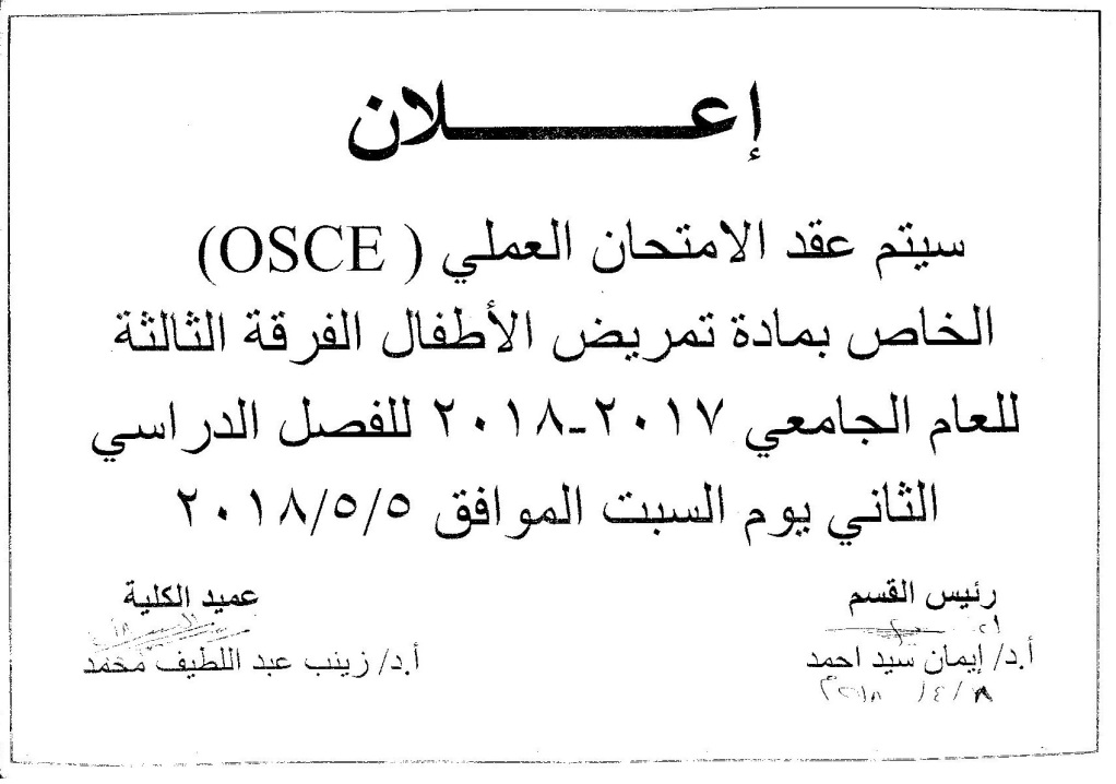 ميعاد عقد امتحان العملي (OSCE) لمادة تمريض الأطفال الفرقة الثالثة 26 أبريل 2018 ميعاد عقد امتحان العملي (OSCE) لمادة تمريض الأطفال الفرقة الثالثة