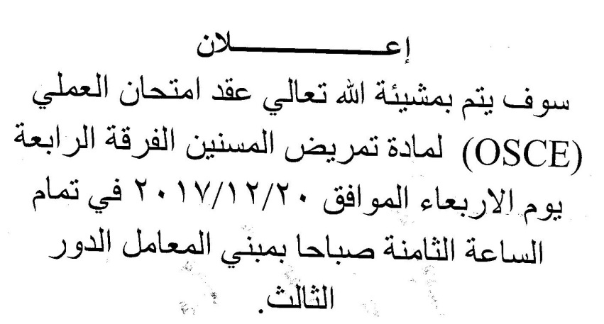 ميعاد عقد امتحان العملي (OSCE) لمادة تمريض المسنين الفرقة الرابعة 27 نوفمبر 2017 ميعاد عقد امتحان العملي (OSCE) لمادة تمريض المسنين الفرقة الرابعة