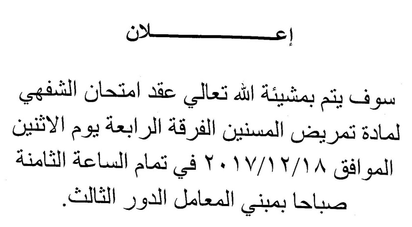 ميعاد عقد امتحان الشفهي لمادة تمريض المسنين الفرقة الرابعة 27 نوفمبر 2017 ميعاد عقد امتحان الشفهي لمادة تمريض المسنين الفرقة الرابعة