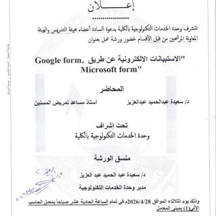 اعلان لحضور ورشة عمل عن الاستبيانات الالكترونية عن طريق Google form,Micr0soft form"
