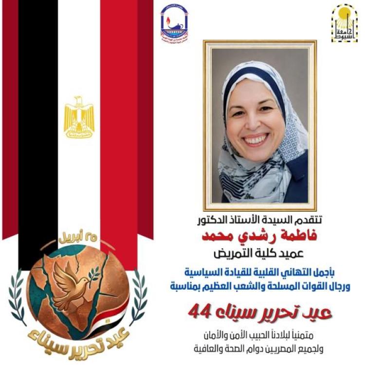 السيدة الأستاذ الدكتور/ فاطمة رشدي محمد عميد الكلية تتقدم بأجمل التهاني القلبية للقيادة السياسية ورجال القوات المسلحة والشعب المصري العظيم بمناسبة عيد تحرير سيناء ٤٤ وكل عام وانتم بخير 📌 #إعلام_كلية_التمريض_جامعة_أسيوط