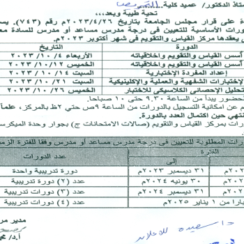 الدورات الاساسية للتعيين في درجة مدرس مساعد أو مدرس للسادة معاوني أعضاء هيئة التدريس التي يعقدها مركز القياس والتقويم في شهر أكتوبر 2023م