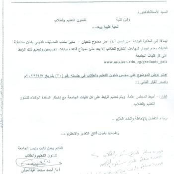 المذكرة الواردة من السيد أ.د/ عمرو ممدوح شعبان - مدير مكتب التصنيف الدولي بشأن مخاطبة الكليات بعدم اصدار شهادات التخرج للطلاب الإبعد ملئ نموذج قاعدة بيانات الخرجين