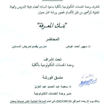 تتشرف وحدة الخدمات التكنولوجية بالكلية بدعوة السادة أعضاء هيئة التدريس والهيئة المعاونة المرشحين من قبل الأقسام لحضور ورشة عمل بعنوان " بنك المعرفة "
