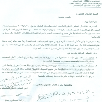 هـــــــام*** المجلس الأعلى للجامعات اعتمد بجلسته 20/5/2023 محضر اجتماع المجلس الأعلى لشئون التعليم والطلاب المتضمن متابعة التقارير الصادرة عن منصة تسجيل الانشطة الطلابية علي مستوي الجامعات المصرية