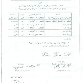 جدول امتحان درجة الماجستير في علوم التمريض (التمريض الباطني والجراحي ) لبرنامج الدراسات العليا بنظام الساعات المعتمدة فصل دراسي ثاني دور يونيو 2023