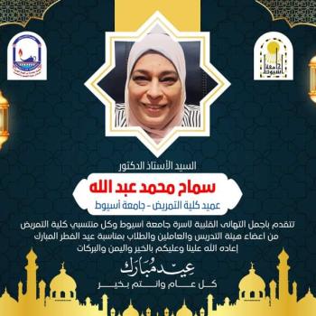 تتقدم السيد الاستاذ الدكتور سماح محمد عبدالله عميد الكلية باجمل التهانى القلبية لاسرة جامعة أسيوط واسرة كلية التمريض وجميع السادة اعضاء هيئه التدريس ومعاونيه والعاملين وأبنائها الطلاب بجامعه اسيوط وكليه التمريض وجموع المسلمين بمناسبه عيد الفطر المبارك